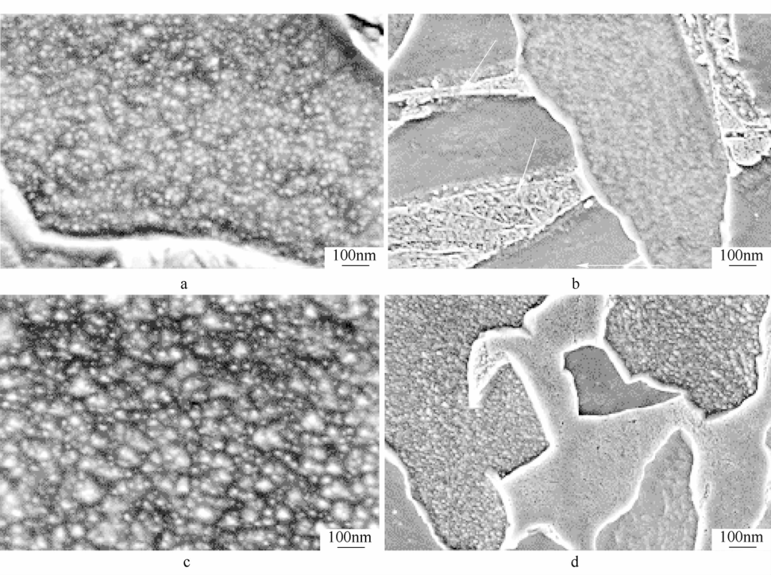 圖1顯示了V-N微合金化低碳貝氏體鋼中碳氮化釩析出相的高分辨掃描電鏡(HRSEM)照片。圖中可見,細小的V(C,N)顆粒在貝氏體鐵素體中析出。析出相的形貌與貝氏體形態有關,粒狀貝氏體中的析出相彌散隨機分布,板條狀貝氏體中的析出相出現類似相間析出的成排分布。貝氏體鐵素體中的V(C,N)析出顆粒都非常細小、均勻,并且析出相也十分穩定。說明V(C,N)析出相是在貝氏體鐵素體板條形成過程中析出,一旦貝氏體板條完成相變,析出相的長大也隨之停止。
