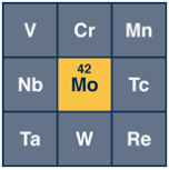 在某些方面,鉬與釩、錸具有對角線關系(對角線關系指元素周期表中一種元素的性質與位于它右下方另一種元素的性質相似)。例如,它們在其最高氧化態下都形成四面體構型的含氧陰離子VO43?、MoO42?和 ReO4?;錸伴生于輝鉬礦(MoS2)中。