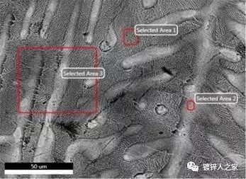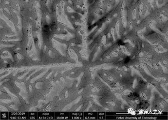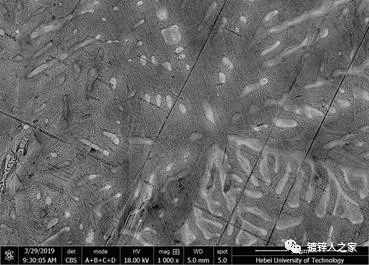 1 “大黑點”缺陷宏觀情況 1.1 問題的提出 “大黑點”缺陷樣板來源于國內某鋅鋁鎂鍍層板生產企業,據廠家生產人員介紹,出現的比例很大,這種黑點缺陷與原有鍍層產品缺陷有根本性的不同,有些離奇古怪,經過大量的分析和現場工藝調整試驗均不能順利解決,都列為困擾鋅鋁鎂鍍層板生產的最大難題之一。 1.2 缺陷相關情況 表1“大黑點”缺陷相關情況 “大黑點”缺陷樣板的照片如圖1所示。 圖1 大黑點缺陷樣板照片 據該鋼廠的技術人員介紹,大黑點缺陷往往會批量發生,時有時無;發生的比例也與產品厚度和鍍層重量有一定的關系,厚板和厚鍍層比較多。是低鋁成分的鍍層,偏薄的規格和鍍層,產品主要應用于建筑板和出口,所謂厚規格一般指0.8mm以上,厚鍍層指100g/m2以上。 1.3 缺陷宏觀分析 大黑點缺陷也是比較規則的圓形,在整個板面的分布很不均勻,有相鄰出現的現象,宏觀特點是直徑大、顏色淺,呈淺灰色,仔細觀察會發現每個黑點都有一個中心點,由中心點向外輻射狀的光澤;更為奇怪的是在太陽光下,看起來輻射狀更加明顯,不過就成了一個不規則的圓形,局部看起來不再是黑色的了,轉動樣板從不同的角度看的話,黑點也會轉動。 2 大黑點缺陷分析 2.1 大黑點區域和正常區域鍍層組織的差異 通過顯微分析,意外發現黑點區域找不到了,原來在顯微鏡下這種所謂的大黑點缺陷看起來顏色與正常區域是一致的,為了在顯微鏡下準確找到大黑點區域,采用了做標記的方法。 結果發現大黑點區域鍍層組織與正常區域也有根本性質的不同。如圖5所示,正常區域的組織晶粒較大,看起來似鋅花一樣;而大黑點區域組織晶粒很小,密密麻麻的,很難區分出晶粒。更仔細觀察,還可以發現在大黑點的中心部位,有不規則的雜質點,由此點向外大量的細小晶粒呈一定的放射狀形態分布。另外,在大黑點區域還能看到散落著若干極小的小黑點。 圖2 大黑點區域和正常區域鍍層組織的差異 2.2 正常區域組織分析 將正常區域的晶粒放大,如圖3所示,可以看出由看起來接近白色的發達的初生樹枝狀單質的相和在樹枝晶間的共晶相組成。 圖3 正常區域晶粒放大 進一步對正常區域的組織進行成分定量分析,如圖4和表2所示。 圖4 正常區域組織成分分析 表2正常區域組織成分對照表 由此可見,正常區域組織主要由富鋅相Zn、二元共晶體Zn+MgZn2 和三元共晶體Zn+Al+MgZn2組成。在正常區域,晶粒尺寸較大,富鋅相有足夠的時間和空間長大,數量較多,而共晶組織較少。 2.3 大黑點區域組織放大分析 將大黑點區域的晶粒放大,如圖5所示,可以看出組織也是由初生樹枝狀單質的相和在樹枝晶間的共晶相組成,與正常區域相比,初生樹枝狀晶相對比較少,而共晶組織較多。 圖5 大黑點區域晶粒放大 進一步對大黑點區域的組織進行成分定量分析,如圖8和表3所示。 圖6 大黑點區域組織放大分析 表3大黑點區域組織成分對照表 由此可見,大黑點區域組織主要也是由富鋅相Zn、二元共晶體Zn+MgZn2 和三元共晶體Zn+Al+MgZn2組成。在大黑點區域,晶粒尺寸較小,富鋅相沒有足夠的時間和空間長大,數量較少,而共晶組織較多。 2. 4 大黑點缺陷分析結論與解決措施建議 由上分析可以看出,本案例的大黑點缺陷是由于結晶組織異常造成的,在鍍層冷卻凝固過程中,局部區域一定范圍內出現了優先凝固現象,產生了大量的晶核,結晶完成后形成了大量小晶粒的組織,在這些細晶粒的內部,初生樹枝狀單質的富鋅相沒有得到充分長大,就開始發生共晶反應,所以樹枝晶很瘦小,而樹枝晶間的共晶相面積較大。 由于富鋅相對光線的反射較強,共晶組織對光線反射較弱,所以看起來這一區域就是一個大黑點。而且這些小晶粒組織在結晶時由一個中心點向外依次結晶,呈現出輻射狀的組織,正是這種輻射狀組織在太陽光下會出現光線的方向選擇性反射,所以不同角度看,明暗區域就不一樣。 那么,什么原因造成這種凝固組織的呢?從圖5中可以看出,在大黑點缺陷的中心,有不規則的雜質,大黑點區域大量的小晶粒是由這個雜質點開始由內向外結晶的,形成了大量有一定方向性的細小晶粒。由此可見這個雜質點是產生缺陷的根本原因。 進一步,鍍層中的雜質點是從何而來的呢?據B鋼廠人員介紹,他們使用的鋅鋁鎂合金錠采購自某采用燃油爐外加熱法生產的企業,結合圖5中的細小深黑點分析,很有可能雜質點和細小深黑點均來自合金錠。雜質點是熔煉過程中產生的金屬氧化物顆粒,而細小深黑點是重油燃燒時產生的炭黑。 因此,建議改用內加熱法生產的鋅鋁鎂錠。據了解,寶鋼在試產低鋁成分的鋅鋁鎂產品時,采用的是內加熱法生產的鋅鋁鎂錠,就沒有發生這種缺陷。 3 熱鍍用合金的冶煉方法對比 目前國內熱鍍用合金可供選擇的方法有內加熱與外加熱兩種方法。 內加熱一般是采用有芯工頻感應電爐。這種內加熱的方法,主要特點是加熱過程沒有氧化,冶煉過程中金屬的燒損率僅0.5~1.0%,冶煉出的合金純度高、質量好,因此大多數熱鍍用合金都是采用這種方法冶煉,但這種冶煉方法的冶煉溫度一般不超過600℃。 外加熱一般是采用明火加熱的反射爐,所用燃料有發生爐煤氣、天然氣、重油等。這種采用外加熱的方法,主要特點是加熱溫度高,一般可以達到700℃~800℃,所以生產效率較高,但是在加熱過程中被加熱的金屬元素會發生嚴重氧化,所以冶煉出的合金
