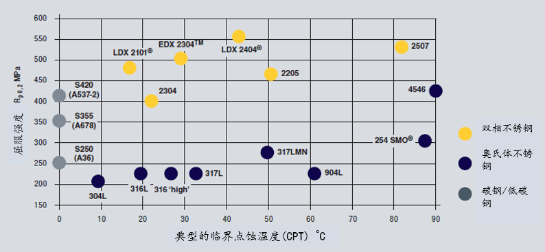 圖1 多個不銹鋼牌號的屈服強度和耐蝕性能,碳鋼作為對比。