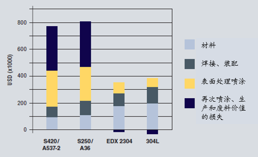 碳鋼儲罐需要防腐措施,這大大增加了其建造成本。設(shè)計碳鋼儲罐時必須留出“腐蝕余量”,即壁厚應(yīng)超出結(jié)構(gòu)強度所需要的厚度,考慮到腐蝕造成的金屬損失。為了防止腐蝕,碳鋼儲罐的內(nèi)外還需要進行噴涂處理,常常還需要額外的陰極或陽極保護。這些防腐措施使涂層碳鋼儲罐的建造成本比雙相不銹鋼儲罐高,尤其是存放腐蝕性物質(zhì)的儲罐。圖2是一個30年壽命周期成本分析的總結(jié),結(jié)果表明雙相不銹鋼儲罐的建造成本比其它材料的儲罐都低。
