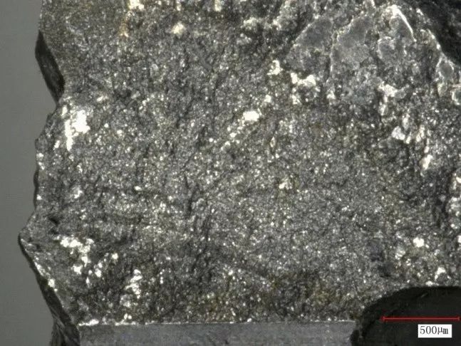 將斷口置于體視顯微鏡下觀察,圖3為1#斷口放大觀察。螺母掉塊斷口呈黑灰色,兩斷口R角處斷面均可見由R角處發散的擴展棱線,并伴有疲勞弧線特征,如圖3a所示;R角半徑較小(見圖3b),過渡區加工痕跡較為明顯;兩斷口內表面朝向螺紋一端的臺階面可見清晰磨損痕跡(見圖3c),在靠近丟失斷口一側磨痕更為明顯。2#斷口與1#斷口宏觀形貌基本一致。