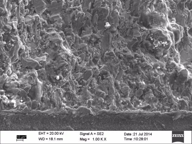 觀察襯套內表面有不同程度的擠壓磨損痕跡,周向磨損痕跡明顯,在花鍵端靠近丟失斷口一側磨損痕跡較對側更深,螺紋端與丟失斷口相反的一側磨損痕跡較深。