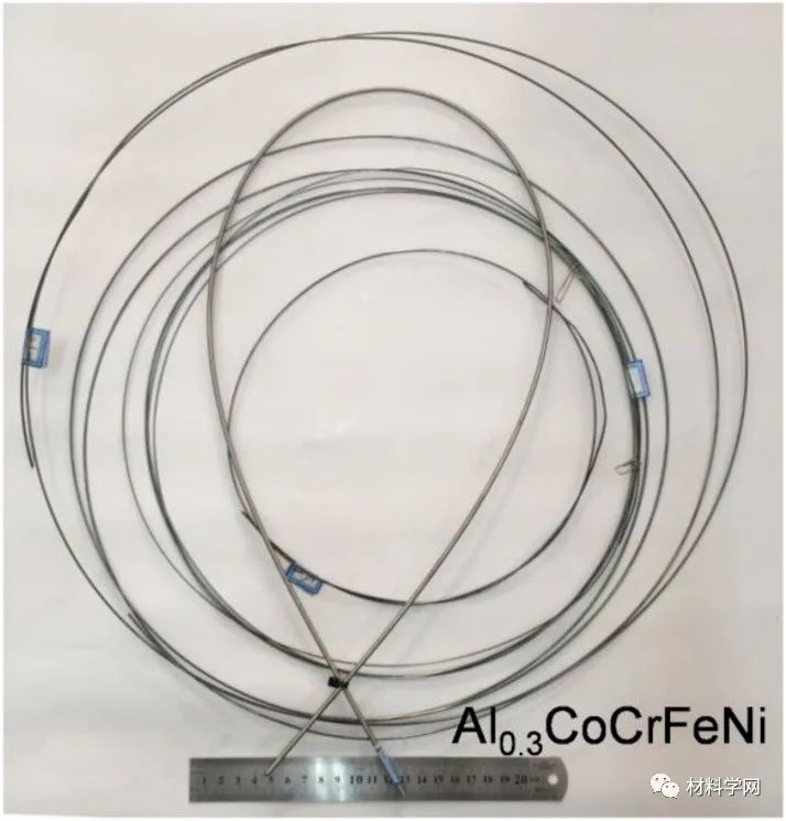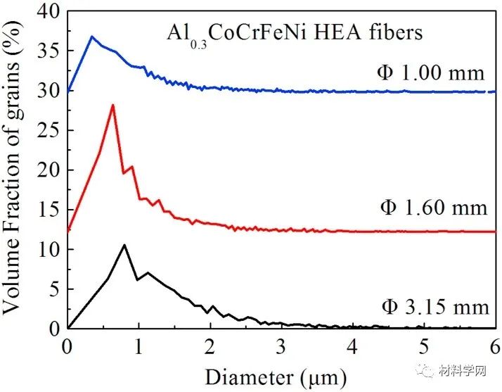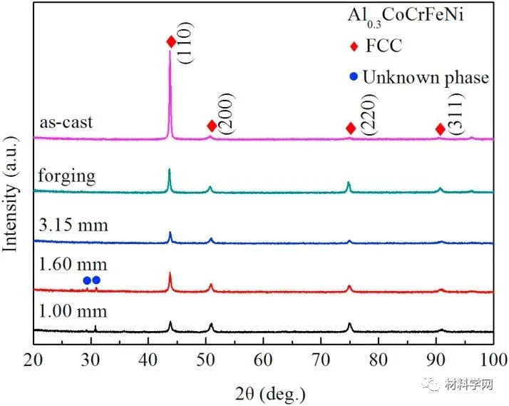 圖1顯示了直徑為1.00-3.15 mm的連續纖維照片。纖維是圓柱形的并且幾乎無瑕疵,這意味著熱拉伸方法是生產高質量HEA纖維的有效技術。圖2示出了經過各種加工技術的Al 0.3 CoCrFeNi合金的X射線衍射圖。確定了主要相,即單一FCC晶體結構。