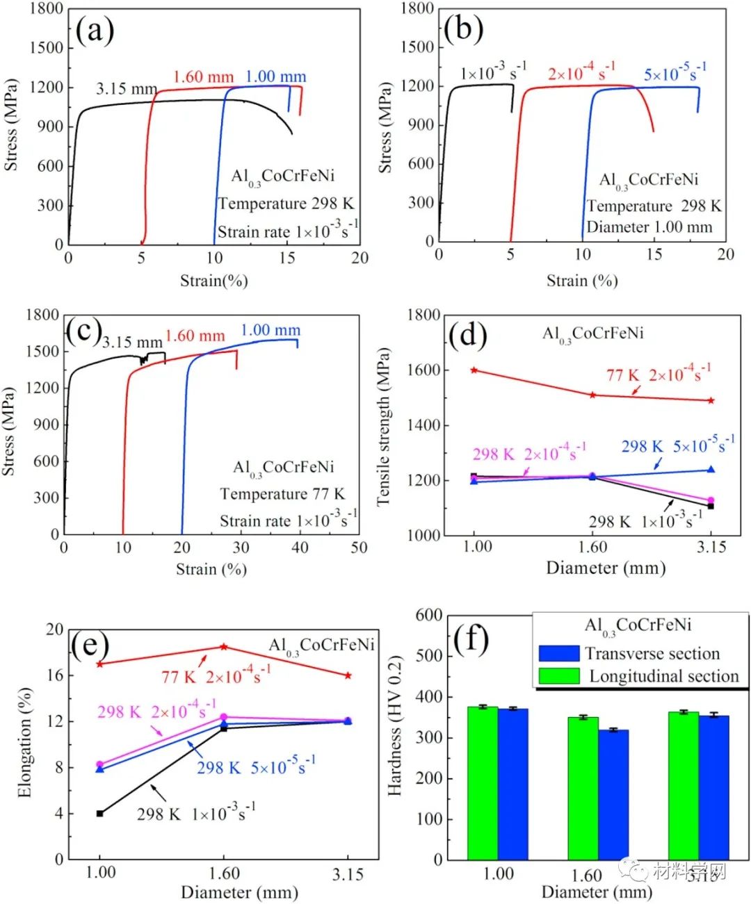綜述所述,本文研究了五元Al0.3CoCrFeNi HEA纖維的微觀結構和力學性能的影響。采用熱旋鍛和熱拉工藝制備的HEA纖維主要織構為<111>和<100>織構。Al和Ni原子之間的強相互作用產生了大約200nm的B2 Al-Ni粒子。在HEA纖維的拉伸試驗中,析出的顆粒和細小的晶粒共同促進了纖維的持續高強度和延展性。特別是直徑為1.00 mm的纖維在298K時表現出了顯著的拉伸強度和延展性,分別為1207 MPa和7.8%,在77K時分別提高到1600 MPa和17.5%。與298K時的平面滑移變形機制相比,77K時變形后出現了形變誘導的納米孿晶,從而提高了77k時的拉伸強度和延性。HEA纖維在低溫下強度與延性的良好結合,為未來高性能HEAs工程材料的開發開辟了一條創新的道路。