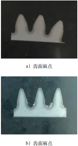 生產(chǎn)中發(fā)現(xiàn)個(gè)別工件滲碳后轉(zhuǎn)磨齒強(qiáng)力噴丸,產(chǎn)品表面出現(xiàn)麻點(diǎn),出現(xiàn)的位置不固定,有時(shí)在齒面的一個(gè)點(diǎn),有時(shí)在齒根,有時(shí)在整個(gè)齒面。問(wèn)題工件如圖2所示。