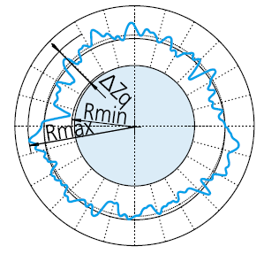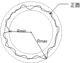 設(shè)置一個(gè)標(biāo)準(zhǔn)圓,這個(gè)圓和被測(cè)圓的半徑差的平方和為最小,把這個(gè)基準(zhǔn)圓的中心坐標(biāo)位置作為測(cè)量圖形的中心,與此同心的測(cè)量圖形上的內(nèi)接及外切兩個(gè)圓的半徑差為圓度。