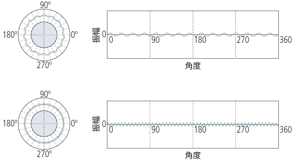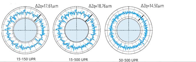 因?yàn)楦鞣N環(huán)境或其他因素的影響,為了剔除其中的噪音,測(cè)量圓度時(shí)需要設(shè)置濾波器截止值。如下圖中展示了濾波器對(duì)測(cè)量結(jié)果的影響。