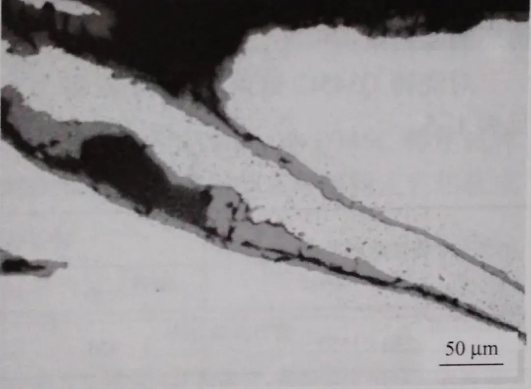 用金相顯微鏡觀察鋼板縱截面試樣,裂紋分布在試樣表層,多呈樹枝狀沿變形最大方向擴展,裂紋處除氧化鐵外,還存在大量聚集分布的灰色顆粒狀夾雜物,見圖1-18和圖1-19。