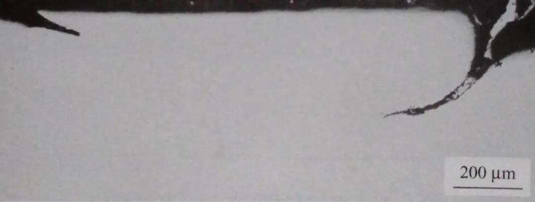 取鋼板截面試樣觀察,缺陷在截面表層呈裂紋形態,深度為0.3~0.8mm。高溫長時間氧化的特征十分明顯、裂紋內側有氧化鐵,一側有大量密集分布的氧化圓點。該類氧化圓點比較粗,放大200 倍下就能觀察到,與軋鋼裂紋周圍細小稀疏的氧化圓點有明顯區別,它是缺陷附近鋼基經高溫加熱氧化的產物。裂紋按形態分為兩類:一類呈粗大的半網狀(圖1-47) : 另一類呈折疊形態斜向伸入鋼基(圖1-48) 。經試劑浸蝕后,裂紋一側(出現氧化圓點側)組織有嚴重的脫碳(圖1-49)。根據以上特征初步判斷,缺陷在加熱軋制前就已存在,且位于板坯棱邊部或窄面。