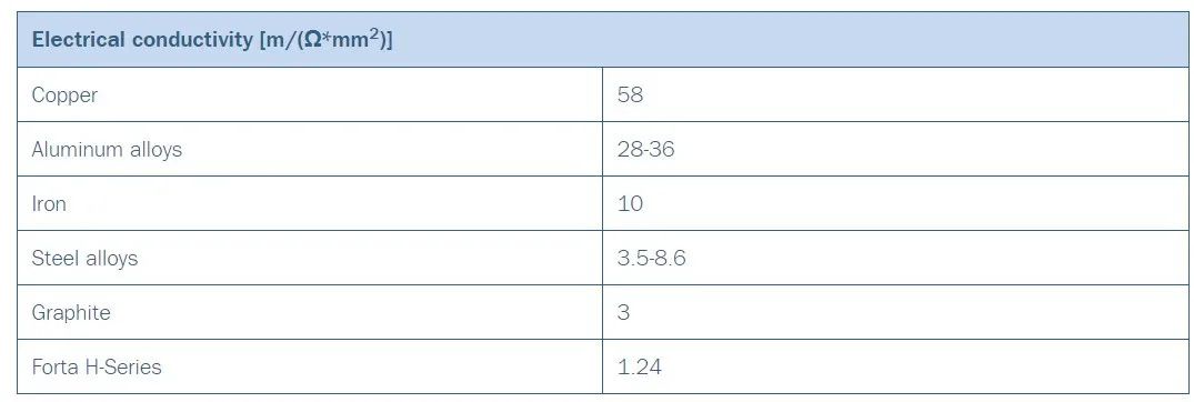 Forta H系列具有1.24 m /(Ω·mm2)的低電導率,對于EMC應用而言,它是鋁的電導率28-36 m /(Ω·mm2)的1/29。由于輻射功率受平方律控制,因此Forta H系列的屏蔽比鋁有效841倍。