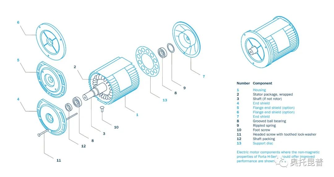 除了非磁性以外,Forta H系列具有很高的強度,含鎳量低且價格穩定。在遠高于EV電動機可能遇到的300~350°C的高溫下,它還能保持其強度。這意味著Forta H系列提供了替代鋁合金的高性能解決方案。圖6中顯示可能使用Forta H系列材料的區域,包括主殼體,端蓋,法蘭端蓋和支撐盤。