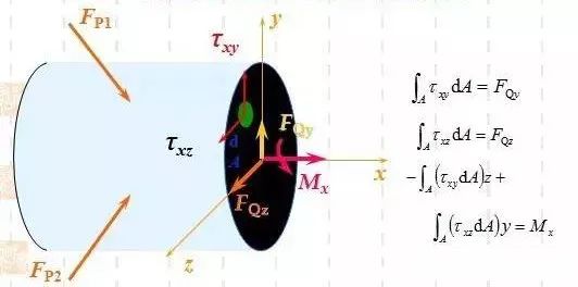 內力分量是截面上分布內力系的簡化結果。應用積分方法,不難得到正應力與軸力、彎矩之間的關系式,剪應力與扭矩、剪力之間的關系式。