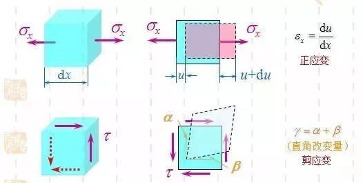 線變形與剪切變形,這兩種變形程度的度量分別稱“正應變”(NormalStrain) 和“切應變”(ShearingStrain)。關于正應力和正應變的正負號,一般約定:拉應變為正,壓應變為負。產生拉應變的應力(拉應力)為正,產生壓應變的應力(壓應力)為負。