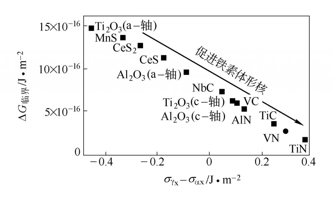 圖3 不同析出物(夾雜物)與鐵素體之間的界面能對形核驅(qū)動力的影響