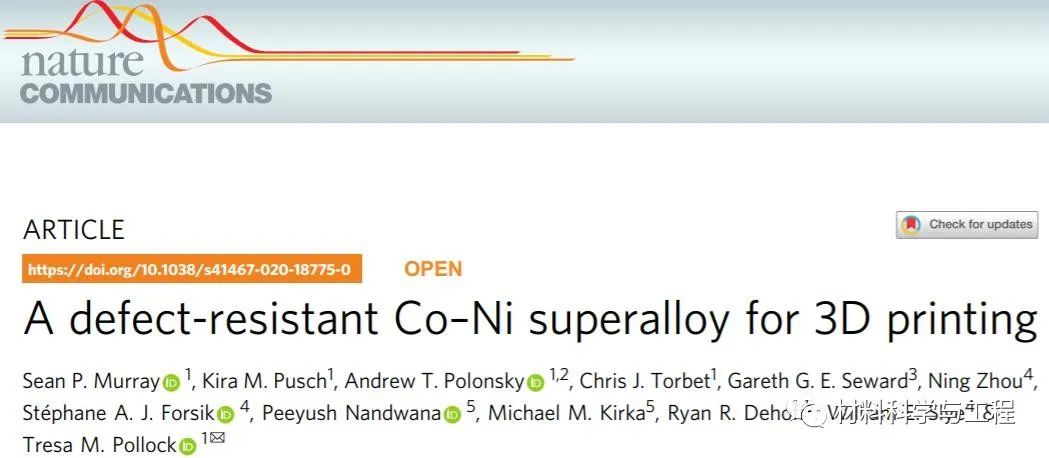 增材制造有望實現高經濟價值金屬材料生產的重大轉變,使具有創新、復雜的設計和最小的材料浪費成為可能。最大的挑戰是合金設計,既要與獨特的添加劑處理條件兼容,又要保證材料性能足以應對能源、空間和核應用等具有挑戰性的環境。近日,來自美國加州大學圣巴巴拉分校的Tresa M. Pollock等研究者,報道了一類高強度、抗缺陷的3D打印高溫合金,成分主要是含有大約相等的Co和Ni,以及Al、Cr、Ta和W。在打印和后期加工時具有超過1.1 GPa的強度,在室溫下拉伸延性大于13%。相關論文以題為“A defect-resistant Co–Ni superalloy for 3D printing”發表在NatureCommunications上。https://www.nature.com/articles/s41467-020-18775-0