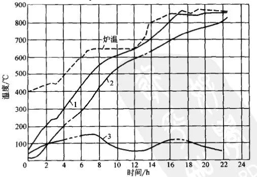 ▲圖1 Φ800mm 40CrNi鋼坯加熱曲線(爐溫950℃裝爐)