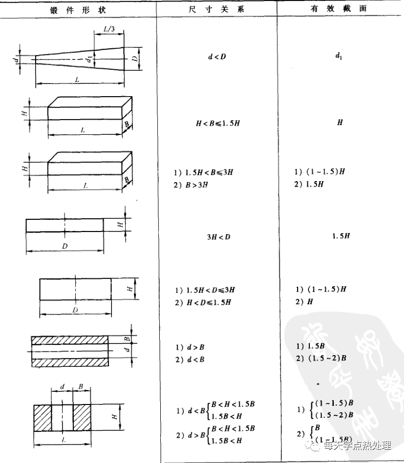 當加熱爐主要測溫儀表(一般臺車式爐指爐頂測溫儀表,井式爐指各段爐壁儀表)指示爐溫到達規定溫度時,即為均溫開始,至目測工件火色均勻并與爐墻顏色一致時為均溫終了。為使工件心部達到規定溫度、完成奧氏體轉變并使其均勻化,鍛件在均溫后尚需進行保溫。保溫時間根據工件有效截面確定。對碳素結構鋼與低合金結構鋼鍛件,保溫時間按0.6~0.8h/100mm計算。對中、高合金鋼鍛件,按0. 8~1h/100mm計算。各種形狀鍛件有效截面計算方法見表2 。