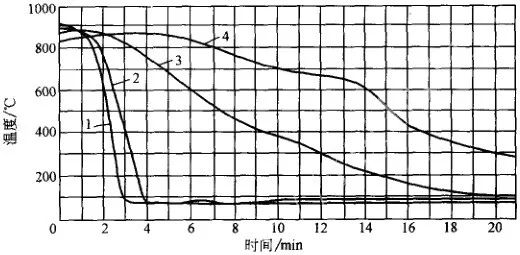 噴霧冷卻是利用壓縮空氣與壓力水的共同作用,使之成為細霧狀向工件表面噴射的冷卻方法。噴水冷卻是將高壓水直接向工件表面均勻噴射的冷卻方法。在噴射冷卻時,工件要旋轉,以使冷卻均勻。這種冷卻方式的優點是在冷卻過程中可以改變風量、水量及水壓,以達到調節冷卻速度的效果,使在不同冷卻階段得到不同的冷卻速度。對有階梯的工件,在不同截面處可以調節得到不同的冷卻能力,使之獲得相同的冷卻速度。噴水冷卻的冷卻能力很強烈,高壓水還可以猛烈沖刷工件加熱時表面形成的氧化皮。圖17 所示為噴霧冷卻曲線,圖18 所示為噴水冷卻曲線。