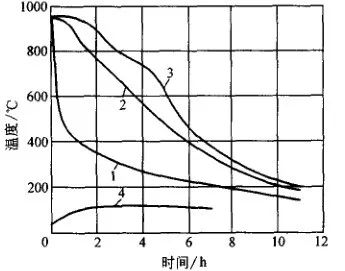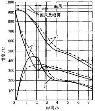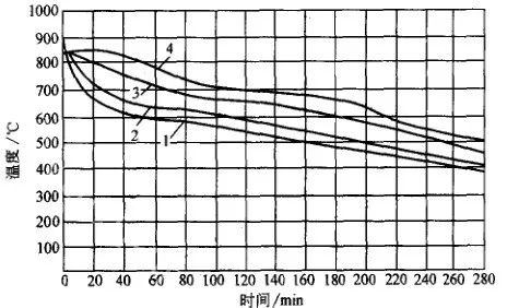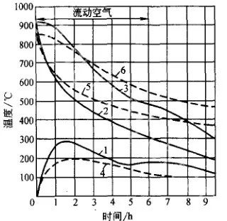 空冷或鼓風冷的冷卻能力比水冷、油冷小得多,故在一定程度內可避免鍛件內部缺陷的擴大,但空冷時鍛件的性能潛力不能充分發揮。圖12 、圖13 是大鍛件的空冷曲線。