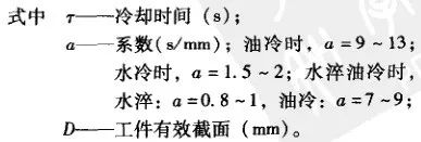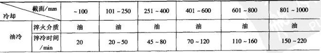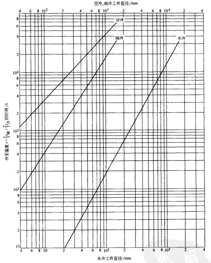 冷卻時間是指工件在冷卻介質中停留的時間。冷卻時間過短,會達不到要求的性能,而冷卻時間過長、終冷溫度過低,會增大淬裂的危險性。所以,確定適當的冷卻時間及終冷溫度,是大鍛件熱處理工藝中的一個重要問題。在生產中的淬火冷卻主要是控制冷卻時間,而工件表面的終冷溫度僅作為參考。冷卻時間一般根據實測的各種冷卻曲線,理論計算以及長期生產經驗來確定。必須注意,即使相同截面的工件,在相同的淬火介質及冷卻時間內冷卻,也會由冷卻設備容量、淬火介質的溫度、介質循環條件及工件在介質中的移動方式等情況不同,造成工件心部溫度的顯著差別。所以,在規定冷卻時間的同時,還要嚴格控制冷卻條件。圖19 和圖20 所示為不同直徑鋼件在水冷、油冷、空冷時,心部冷卻到450℃和300°C 時所需的冷卻時間(淬火溫度取為860°C, 淬火介質溫度取為40℃) , 曲線是由實測數據整理而得到的。表3 列出一些具體冷卻工藝可供參考,生產中根據工件形狀、材質及生產條件,在制訂具體冷卻工藝時,作適當調整。▼表3 具體冷卻舉例