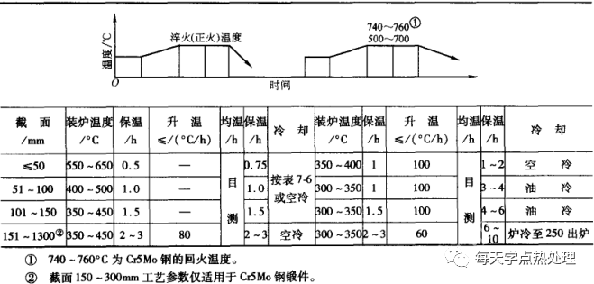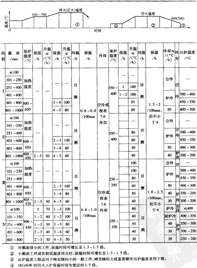 ▼表7 1Cr13、2Cr1、Cr5Mo大型鍛件熱處理工藝規范