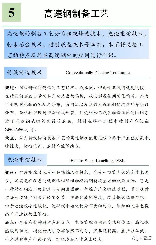 高速鋼(HSS)是一種具有高硬度、高耐磨性和高耐熱性的工具鋼,又名風(fēng)鋼或鋒鋼,意思是淬火時即使在空氣中冷卻也能硬化,并且很鋒利,或稱白鋼。高速鋼材料主要由兩種基本成分構(gòu)成:一種是金屬碳化物(如碳化鎢、碳化鉬或碳化釩),它賦予材料較好的耐磨性及強度;二是分布在碳化物周圍的鋼基體,它使材料具有較好的韌性和吸收沖擊、防止碎裂的能力。高速鋼的紅硬性高、耐磨性好、工藝性能好、強度和韌性配合好,因此主要用來制造復(fù)雜的薄刃和耐沖擊的金屬切削刀具,也可用于制造性能要求高的冷作模具、軋輥、高溫軸承和高溫彈簧等。