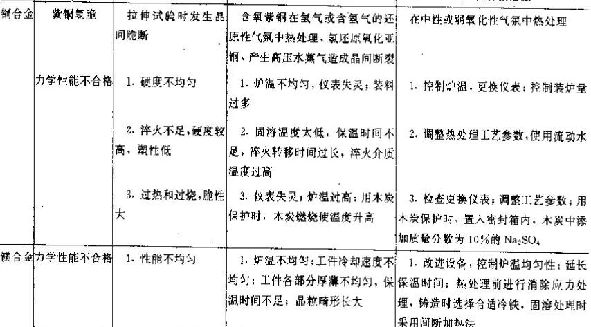 有色金屬因為熱處理不當,引起力學性能不合格的常見原因及防止方法見表3 。
