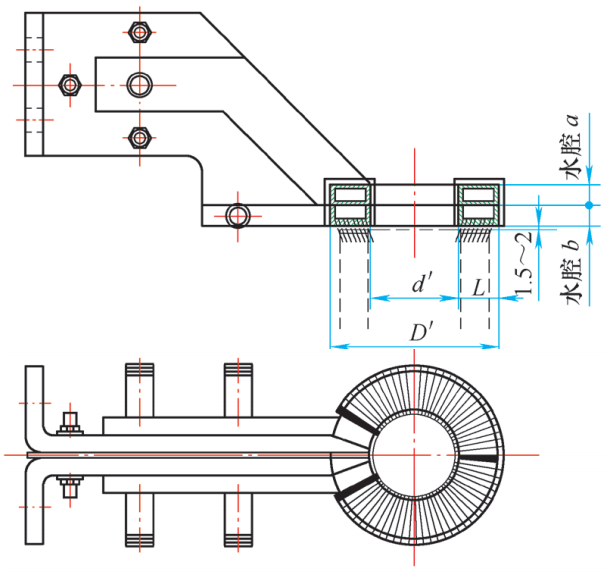淬火工藝過(guò)程:零件上料→到達(dá)加熱位置→零件旋轉(zhuǎn)→感應(yīng)器加熱啟動(dòng)→加熱到溫→感應(yīng)器加熱停止→零件迅速到達(dá)噴水位置→噴水起動(dòng)→噴水一定時(shí)間之后,噴水停止→零件到達(dá)下料位置→零件下料。差速器殼屬于平面類(lèi)零件,根據(jù)產(chǎn)品技術(shù)要求,設(shè)計(jì)如圖3所示的淬火感應(yīng)器,具體設(shè)計(jì)參數(shù)見(jiàn)表1,調(diào)試參數(shù)見(jiàn)表2,淬硬層檢測(cè)結(jié)果見(jiàn)表3。