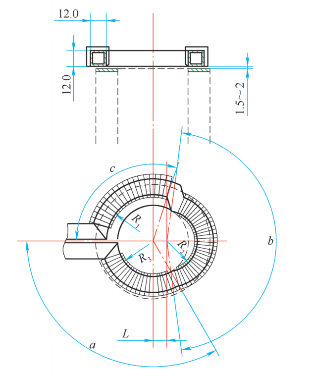注意事項(xiàng):在感應(yīng)器調(diào)整過(guò)程中,注意感應(yīng)器底平面與零件端面間隙1.5~2mm,各處間隙均勻;定期清理有效加熱面的氧化皮。從表3可以看出,常規(guī)平面加熱感應(yīng)器存在不足之處:R1處淬硬層深太淺,接近下限,由于齒高10mm,齒頂、齒根溫差較大,若控制不注意,容易產(chǎn)生裂紋,故而設(shè)計(jì)如圖4所示的異形感應(yīng)器。異形感應(yīng)器有效圈添加開(kāi)口朝下的“∏”形導(dǎo)磁體,如圖5所示。