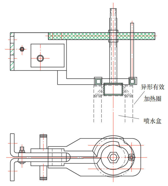 注意事項(xiàng):感應(yīng)器調(diào)整過(guò)程中,注意感應(yīng)器底平面與零件端面間隙1.5~2mm,各處間隙均勻;定期清理有效加熱面的氧化皮。不足之處:異形感應(yīng)器對(duì)于零件吸引力較大,加熱過(guò)程中將零件吸起會(huì)造成無(wú)法生產(chǎn),因此需要將常規(guī)的孔軸配合式夾具(見(jiàn)圖6)更換為氣動(dòng)卡盤(pán)裝夾(見(jiàn)圖7),這樣就需要卡盤(pán)防水等級(jí)較高,同時(shí)需要對(duì)感應(yīng)器有效圈強(qiáng)度進(jìn)行加強(qiáng),否則容易導(dǎo)致有效圈變形。