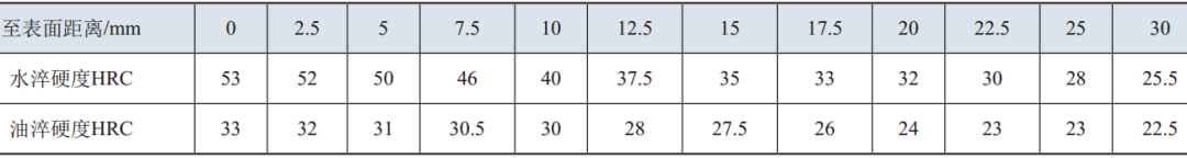 處理后的試樣表面沒(méi)有淬火裂紋。加工表面檢測(cè)硬度,由表面到心部,每隔2.5mm測(cè)量硬度,如圖2所示。硬度結(jié)果見(jiàn)表2。從表2中可以看出,水淬后的硬度高,而且淬硬層較深。