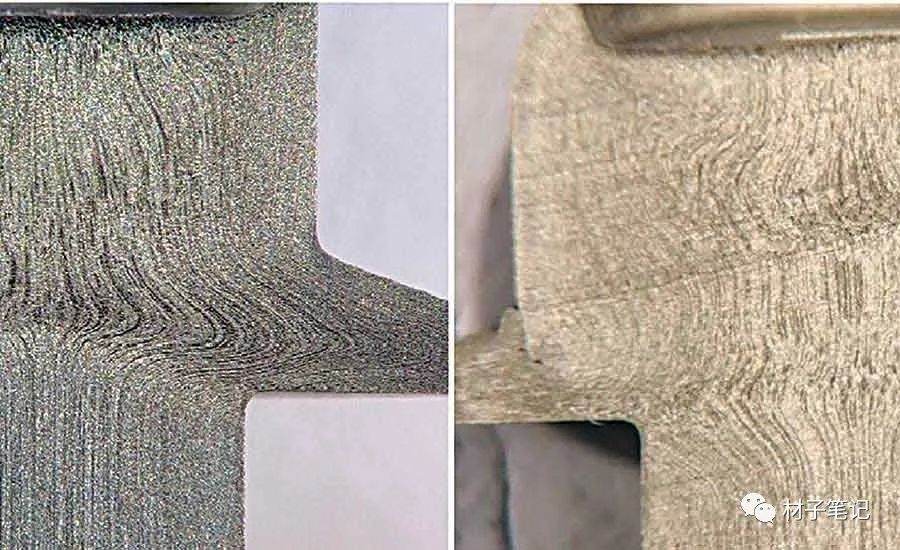 圖 2 在頭部成形過程中,金屬的晶粒流線向正確的方向成形是非常重要的。左邊的圖像表示符合SAE USCAR8規范的可接受顆粒流。