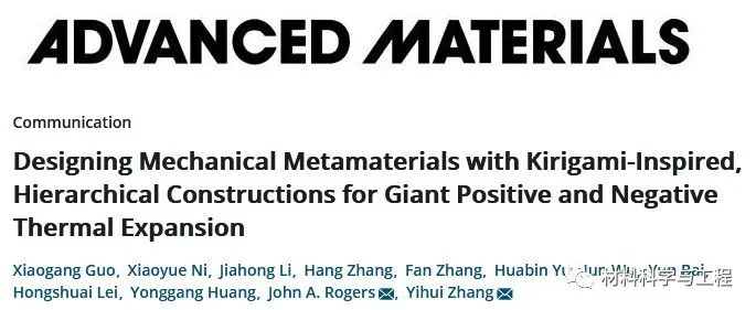 清華大學(xué)張一慧教授等人介紹了一種高度填充的分層超材料設(shè)計(jì),具有CTE大范圍的可調(diào)性以及大的熱變形。相關(guān)論文以題為“Designing Mechanical Metamaterials with Kirigami-Inspired, Hierarchical Constructions for Giant Positive and Negative Thermal Expansion”發(fā)表在Advanced Materials上。https://onlinelibrary.wiley.com/doi/abs/10.1002/adma.202004919