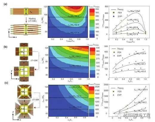 圖2 kirigami啟發(fā)的2D分級(jí)設(shè)計(jì)與正熱膨脹的微結(jié)構(gòu)-性能關(guān)系。a)基本致動(dòng)元件的圖示(左)、根據(jù)LPI/WPI和LPMMA/LP模擬的CTE放大系數(shù)的等高線圖,以及四個(gè)不同LPI/WPI的CTE與LPMMA/LPI的放大系數(shù)。其他參數(shù)固定為L(zhǎng)Jpoint = 2mm和WPI = WPI = WPI = 100m。b)2D分層超材料的圖示(左)、CTE在L2/L1和LPI/WPI方面的模擬放大系數(shù)的等高線圖(中),以及三種不同LPI/WPI的CTE與L1/L2的放大系數(shù)(右)。其他參數(shù)固定為L(zhǎng)Joint = 2 mm,WPI = WPI = WPI = 100 m,= 15 mm,Le/ L1 = 0.86,LPMMA/LPI = 0.8。c)帶有梯度設(shè)計(jì)的2D分層超材料的圖示(左)、CTE在L2/L1和LPI方面的模擬放大系數(shù)等高線圖,1/WPI(中),以及CTE與L1/L2在三種不同LPI下的放大系數(shù),1/WPI(右)。其他參數(shù)固定為L(zhǎng)Joint = 2 mm,WPI = WPI = WPI = 100 m,Le,1/L1 = 0.84,LPMMA/LPI = 0.8。