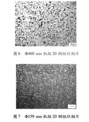 包鋼鋼管公司 59 mm 機(jī)組生產(chǎn)銅管以小規(guī) 格薄壁為主,φ460 mm 機(jī)組生產(chǎn)的鋼管以大規(guī)格厚 壁為主,從現(xiàn)場抽取化學(xué)成分 ω[C] 0.18% - 0.21% 之間, Mn 含量在 0.45% 以下的爐號,分別從 φ159 mm 機(jī)組和 φ460 mm 機(jī)組取規(guī)格為 76 mm x4 mm φ406mm x40 mm 對比樣進(jìn)行了 組織性能檢驗對比 兩個規(guī)格組織相片見圖5,圖6, 圖7.