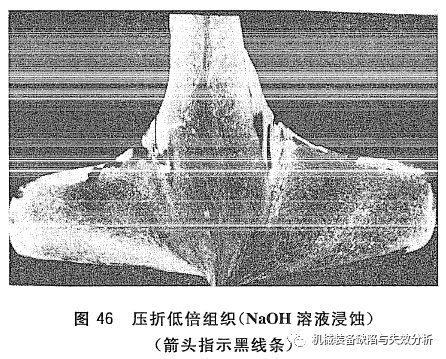 在模壓鍛件低倍試樣的邊緣,出現由內向里斜向延伸,終端常呈須狀分叉的光滑折縫線稱為壓折。壓折通常出現在模鍛件的肋條與腹板之間的過渡圓弧位置,壓折處一般伴隨著有局部流紋不順。