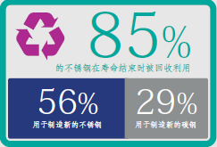 回收利用不銹鋼對經濟和環境都是非常有益的。不銹廢鋼價值高,值得收集和分類,這也正是不銹廢鋼回收率高的原因。重新利用廢鋼中寶貴的合金元素可降低成本,減少資源消耗和對環境的影響,同時還可以降低能耗。高報廢回收率表明產品的生命周期結束后不銹鋼的回收效率。原則上,只要產品設計和回收技術允許,不銹鋼可以無限循環利用。廢鋼是二次原料,包括產品生產過程中產生的廢料和使用后報廢的產品。