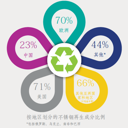 不銹鋼再生成分比例是生產新不銹鋼時使用的廢鋼量占比。在世界許多地區,新不銹鋼中的再生成分比例遠高于全球平均廢鋼使用率所表明的44%。 中國不銹鋼生產的再生成分比例很低(23%),對全球的平均值有巨大影響。