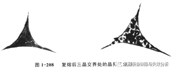 (4)晶界三角形:這種組織和處于三晶交界處的化合物不同,其邊界彎曲,類似弧形,其共晶組織復熔的象征。