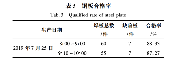 現場跟蹤激光拼焊生產并統計生產數據,發現焊板合格率僅為88%左右,合格率較低,如表3所示。通過對材料進行組織、成分和力學性能分析可知,組織比較均勻,未見偏析和夾雜,碳當量較低,且延伸性也較好,適宜焊接成形。