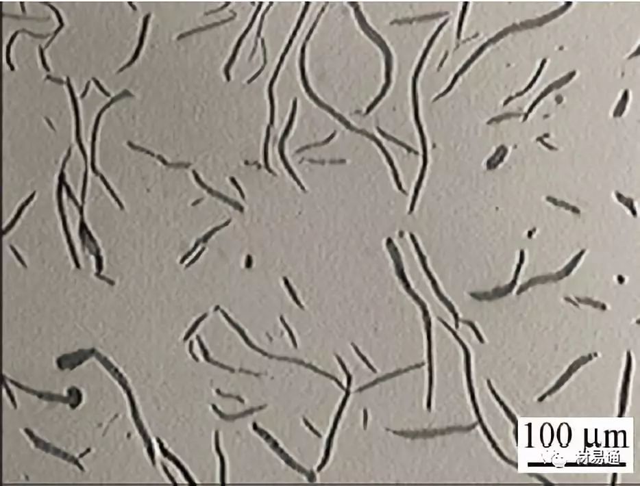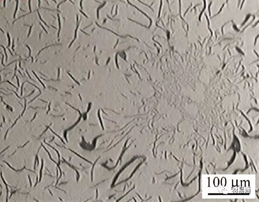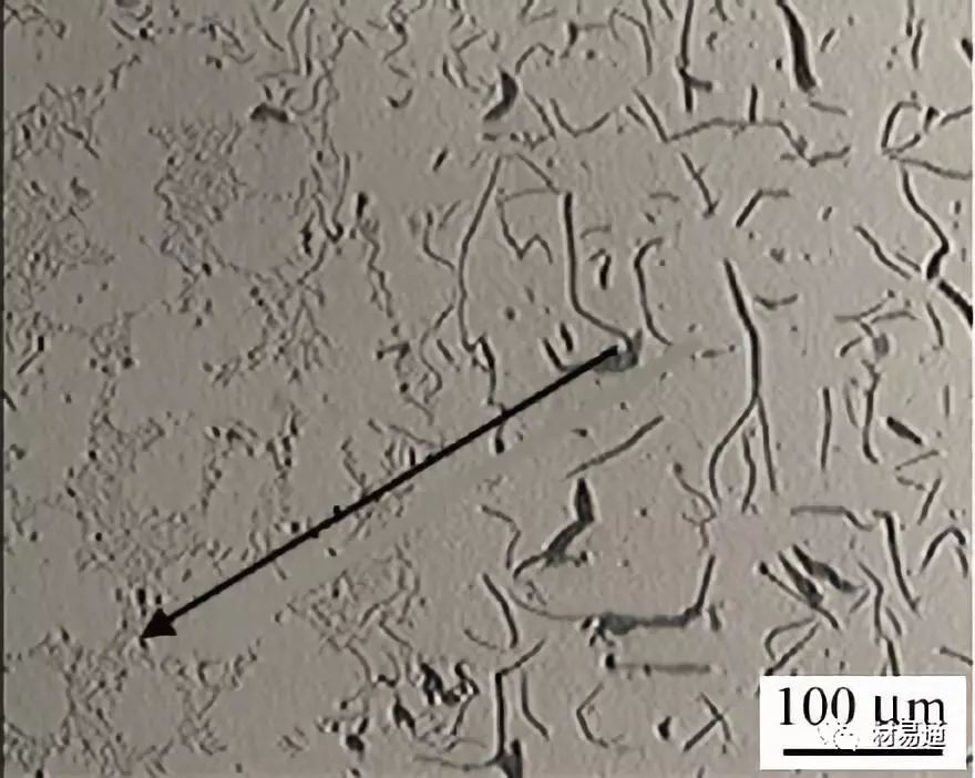 E型(枝晶片狀)石墨也是一種過冷石墨,是在過冷度比產生D型石墨更大時形成的,因此其分布更不均,方向性也更明顯,對鑄鐵的性能也更加不利。E型石墨存在于碳含量較低的亞共晶成分的鑄件中,鐵液凝固時,先析出樹枝狀奧氏體初晶,余下的鐵液發生共晶轉變,一部分轉變為D型或A型,另一部分在奧氏體的二次分枝間呈方向性排列即為E型。E型石墨是亞共晶鐵液在比形成D型石墨更小的過冷度下形成的,所以石墨片較D型要長。E型石墨不會單獨出現,它常同D型、A型石墨共生。一般一個金相視場中E型石墨所占面積比例不超過20%。E型石墨使鑄件性能呈方向性,生產中應加以控制。