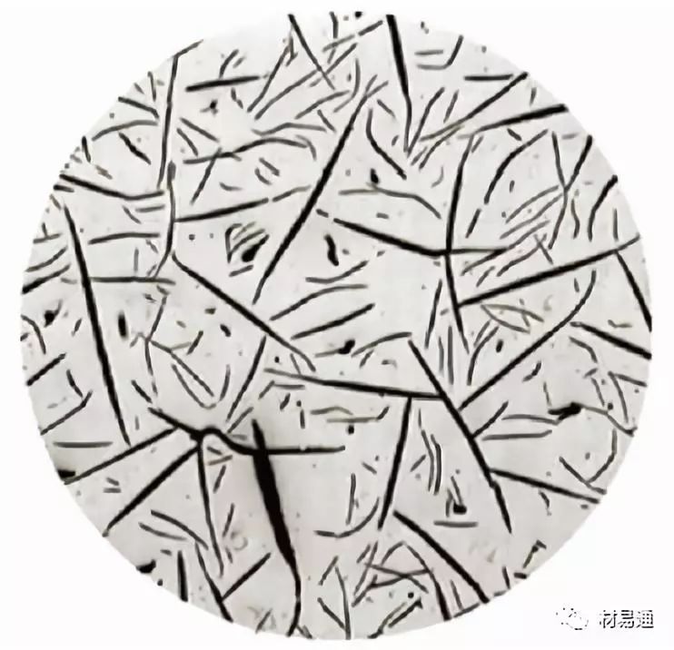 A型(直片狀)石墨是亞共晶灰鐵在較高共晶度(碳飽和度或碳當量)且過冷度不大時的正常、均勻分布也是最常見的石墨組織,它對金屬的割裂作用較低同時具有這種石墨的鑄鐵珠光體含量高,故強度和耐磨性好。通常,A型石墨應占石墨總量的90%以上。