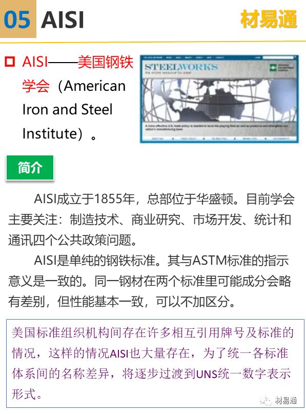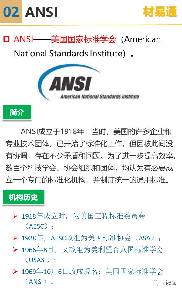 美國有多家學會、協(xié)會從事金屬標準化工作,其中涉及金屬材料的標準化機構(gòu)就超過20個,大家比較熟知的有:ANSI(美國國家標準)、ASTM(美國材料與試驗學會標準)、ASME(美國機械工程師協(xié)會標準)、AISI(美國鋼鐵學會標準)等。