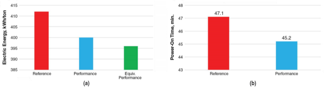 圖9 使用ArcSave對不銹鋼生產出鋼溫度(a)和電極消耗(b)降低的影響