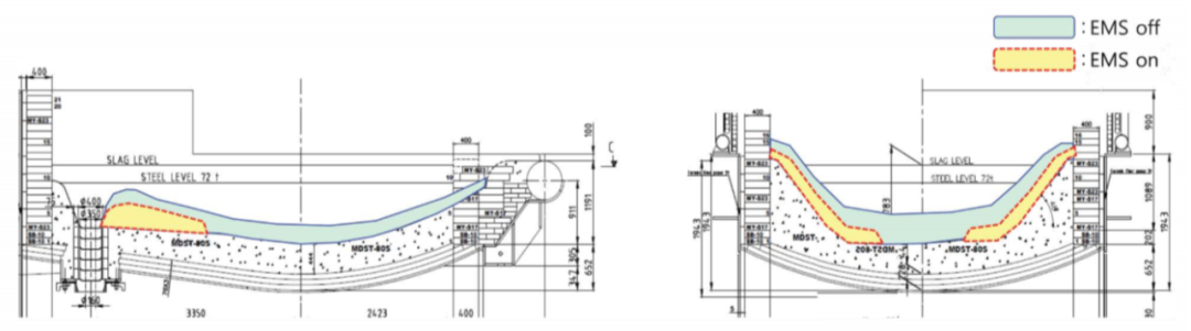 如前一節所討論的,SeAH鋼廠安裝ArcSave的主要目標之一是解決爐底結殼問題。用激光測距儀測量爐底結殼厚度,比較使用EMS和參考試驗不使用EMS時的結殼厚度的變化。圖8給出了爐內結殼輪廓總體示意圖,結殼厚度從無EMS時的700 - 1000mm減少到使用EMS時的200mm。結殼厚度的減少在某種程度上是依賴于EMS的運行功率,就目前的情況而言,1400安培的EMS電流對于減少結殼的形成更為有效。