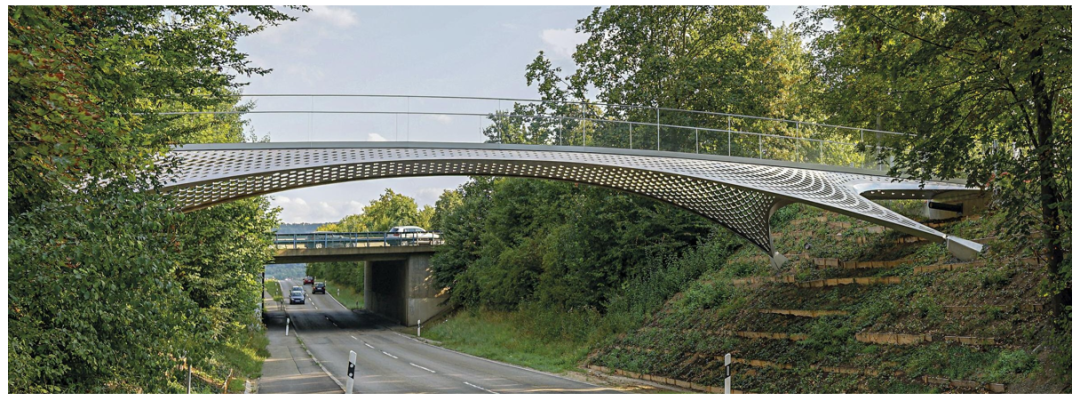 這座橋乍看上去像一塊大的金屬絲綢,但這座輕盈的步行橋不僅僅是漂亮,它還為實現(xiàn)高效及可持續(xù)的結(jié)構(gòu)設(shè)計提供了新的選擇。位于德國斯圖加特附近迪津根的通快集團(TRUMPF),其業(yè)務(wù)不斷增長并在國際上取得成功,工廠需要擴大,唯一途徑是擴張到繁忙鄉(xiāng)村道路的另一邊。廠區(qū)被一分為二,從一個區(qū)域到另一個區(qū)域很麻煩,除了過馬路,進出安全檢查也增加了時間。這座步行橋?qū)蓚€生產(chǎn)區(qū)域連接了起來,不僅方便了為員工和訪客在廠區(qū)間穿行,也作為當前激光切割技術(shù)(公司的主要產(chǎn)品之一)的一個展示。