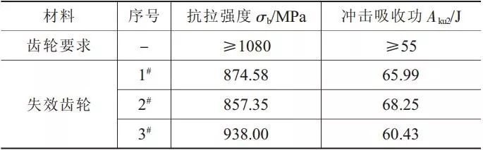 從表 2 可看出,失效齒輪的抗拉強度為 857.35~938.00MPa,低于標準規定的最低值1080 MPa;沖擊吸收功為 60.43~68.25J,高于標準規定的最低值 55J,滿足標準要求。