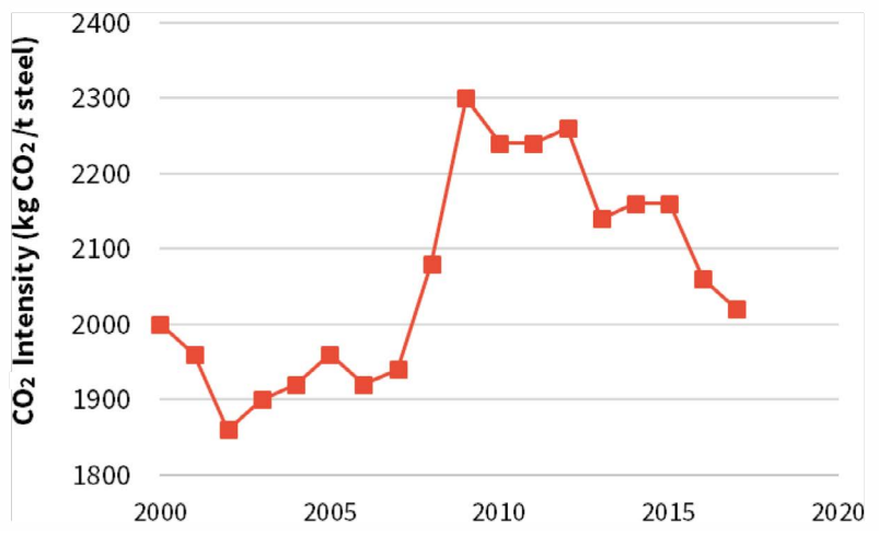 圖2 鋼鐵生產(chǎn)直接排放二氧化碳強(qiáng)度