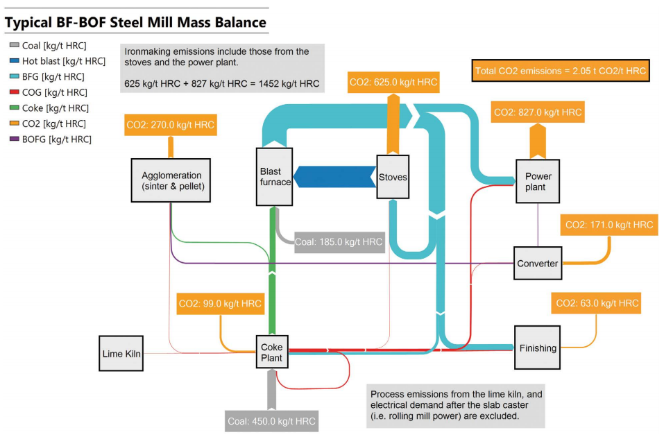 (圖中左上:煉鐵排放包含熱風(fēng)爐和動(dòng)力廠,525kg/t HRC + 827 kg/t TRC = 1452 kg/t HRC;圖中右下:從石灰窯中的排放,和板坯連鑄后的電力需求(如軋鋼需要的電能)不包含在內(nèi))